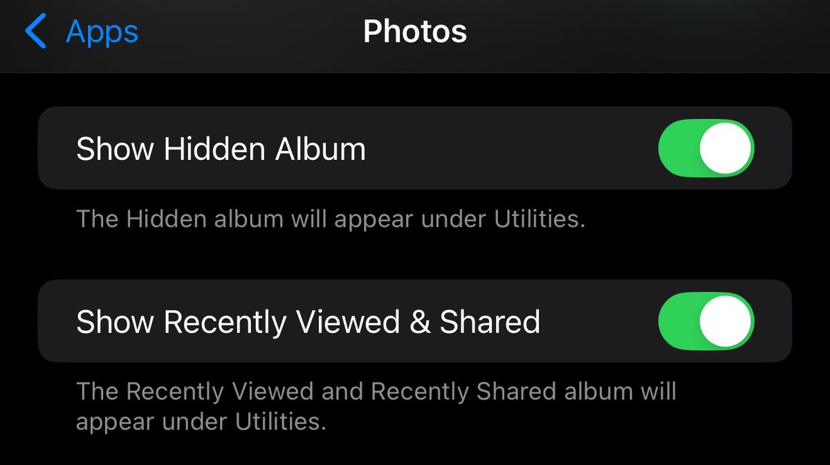 Yüklendikten sonra, ‘Son Görüntülenen’ ve ‘Son Paylaşılan’ galerilerinizi devre dışı bırakma yetkiniz, Ayarlar uygulamasına giderek ‘Uygulamalar’ı seçip ardından ‘Fotoğraflar’ı seçerek elde edilebilir. Devre dışı bırakıldığında, bu albümler sadece Yardımcılar bölümünde görüntülenebilir hale gelecektir.