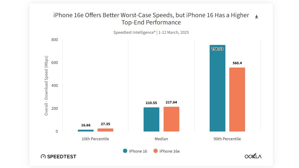 Ookla (üzerinden 9to5Mac) ABD’deki iPhone 16 ve iPhone 16e kullanıcılarından veri topladı ve iPhone 16e’nin 27.35Mbps’lik 10uncu yüzdelik indirme hızları sunduğunu, iPhone 16’da ise 16.66Mbps olduğunu buldu. Bunlar, her iki telefonun da en düşük performansı yaşayan kullanıcıların bekleyebileceği hızlardır.